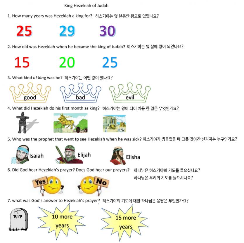 5 “너는 내 백성의 지도자 히스기야에게 돌아가서 그의 조상 다윗의 하나님 나 여호와가 이렇게 말한다고 일러 주어라. ‘나는 네 ____를 들었고 네 ____을 보았다. 내가 너를 고칠 것이며 너는 3일 만에 성전으로 올라갈 것이다.